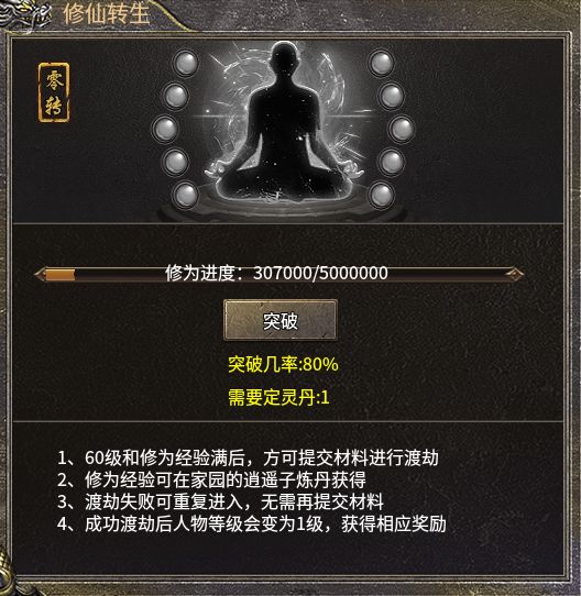 当角色达到60级并且修为经验达到上限后,就可以提交所需材料申请渡劫,如果渡劫失败,玩家可以重复进入渡劫场景再次尝试,无需额外提交材料。成功渡劫后,人物等级将重置为1级,同时获得相应的渡劫奖励,开启新的成长阶段。