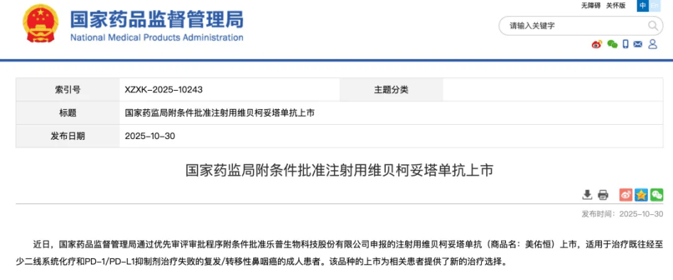 10月30日,国家药品监督管理局(NMPA)官网显示,乐普生物申报的的注射用维贝柯妥塔单抗(MRG003)获批上市,用于治疗既往经至少二线系统化疗和PD-1/PD-L1抑制剂治疗失败的复发或转移性鼻咽癌(NPC)患者。