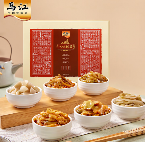 乌江六味榨菜是乌江榨菜专为礼赠场景打造的礼盒产品,其中包含六款不同风味的榨菜,覆盖多样口味需求。原料方面,礼盒甄选重庆涪陵的优质青菜头,为榨菜的核心口感奠定基础。工艺层面,乌江六味榨菜均遵循“三清三洗”“三腌三榨”的非遗制作工艺,历经13道工艺、28道工序,最终造就鲜香嫩脆的稳定品质。正是对食材本味与传统工艺的坚守,让乌江六味榨菜礼盒成为兼具地域特色与实用价值的礼赠选择。