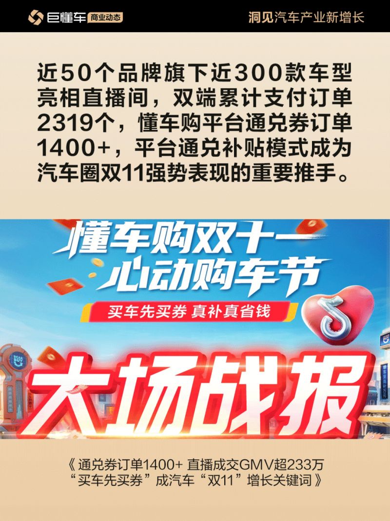 当传统电商平台为“双11”增长乏力而困扰时,汽车圈的“双11”却呈现出截然不同的景象。11月5日,懂车购“双11心动购车节”直播正式开启。在11月5日至7日的三天时间内,近50个品牌旗下近300款车型亮相直播间,懂车帝和抖音双端累计支付订单2319个,成交GMV233.2万。懂车购平台通兑券三天订单1400+,平台通兑补贴模式成为汽车圈“双11”强势表现的重要推手,也让汽车交易线上化迎来全新的发展阶段。