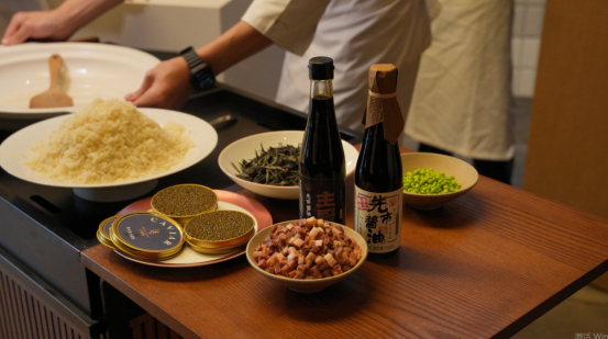 压轴的酱油炒饭配卡露伽鱼子酱,更是将这款调味的优势发挥到极致。徐孝洪选用隔夜米饭,翻炒时分三次加入该调味,确保每一粒米饭都均匀吸饱酱香,呈现出油亮均匀的酱色,却不掩盖米饭本身的清香。与 “黑色黄金” 卡露伽鱼子酱搭配后,炒饭的醇厚酱香与鱼子酱的咸鲜爆破感碰撞,家常菜品瞬间升级为非遗级精致美味。