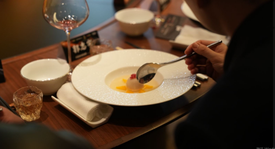 其醇厚酱香与板鸭的发酵风味深度交融,层层渗透进海参肌理,让原本寡淡的海参变得风味饱满,山珍与海味的碰撞在酱香加持下更具层次感。鲜辣恒温三文鱼则跳出传统框架,徐孝洪以这款调味为基底,搭配鲜辣椒调制酱汁。其柔和咸鲜中和了辣椒的锐利,让辣味变得温润有层次,同时最大程度激发三文鱼的丰腴本味。恒温慢煮后的鱼肉嫩滑弹牙,裹上酱香酱汁,入口先尝鱼肉原鲜,再品鲜辣与醇香的递进,味觉体验丰富立体。