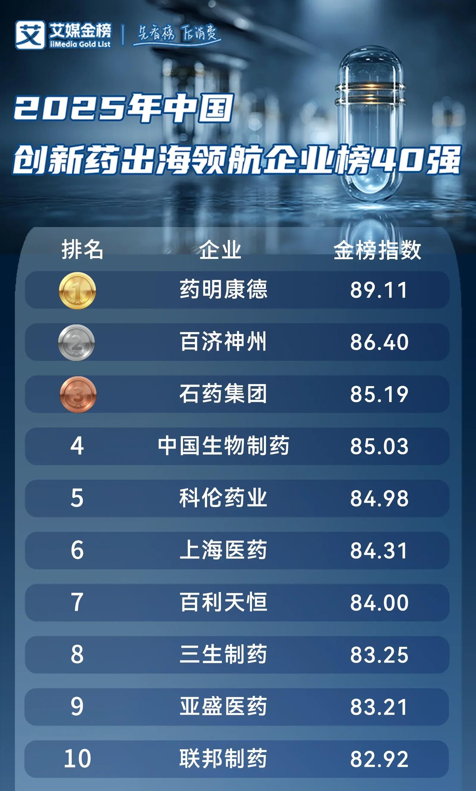 iiMedia Research(艾媒咨询)于11月18日在新加坡2025商业与慈善论坛会上全球首发《2025年中国创新药出海领航企业榜40强》,TOP10企业依次为:药明康德、百济神州、石药集团、中国生物制药、科伦药业、上海医药、百利天恒、三生制药、亚盛医药、联邦制药。其中,药明康德以89.11的金榜指数位居榜首,百济神州(86.40)、石药集团(85.19)分列第二、第三。