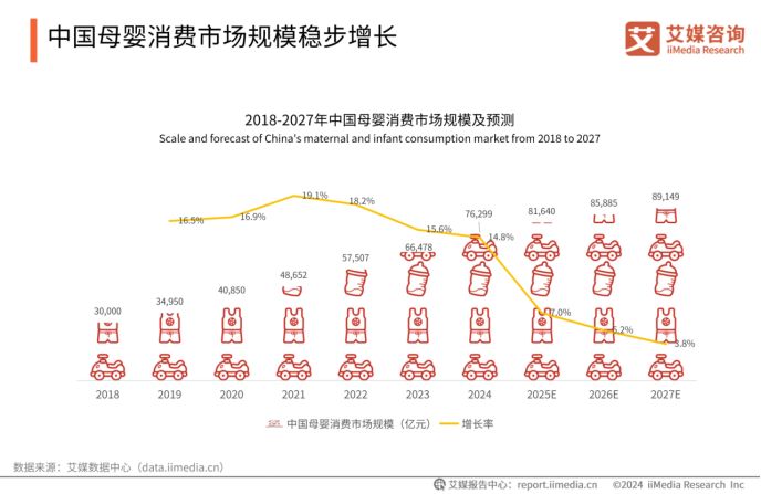 近年来,中国母婴市场历经多重变革:经济波动影响人们的消费能力,精细化喂养趋势重塑市场需求结构,95后、00后新生代父母逐渐成为消费主力,推动代际观念变迁,新国标落地更直接抬高行业门槛。iiMedia Research(艾媒咨询)数据显示,2024年中国母婴消费市场规模达76299亿元,预计2027年将增至89149亿元,市场潜力持续释放。