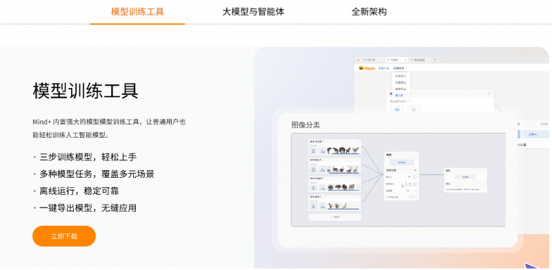 Mind+ 2.0 集成低门槛AI模型训练工具,让普通用户也能轻松训练专属模型。通过“数据准备→模型训练→校验部署”的简洁流程,配合一键导出与离线运行功能,用户可快速实现图像、语音等智能识别应用,让普通用户也能轻松训练人工智能模型。