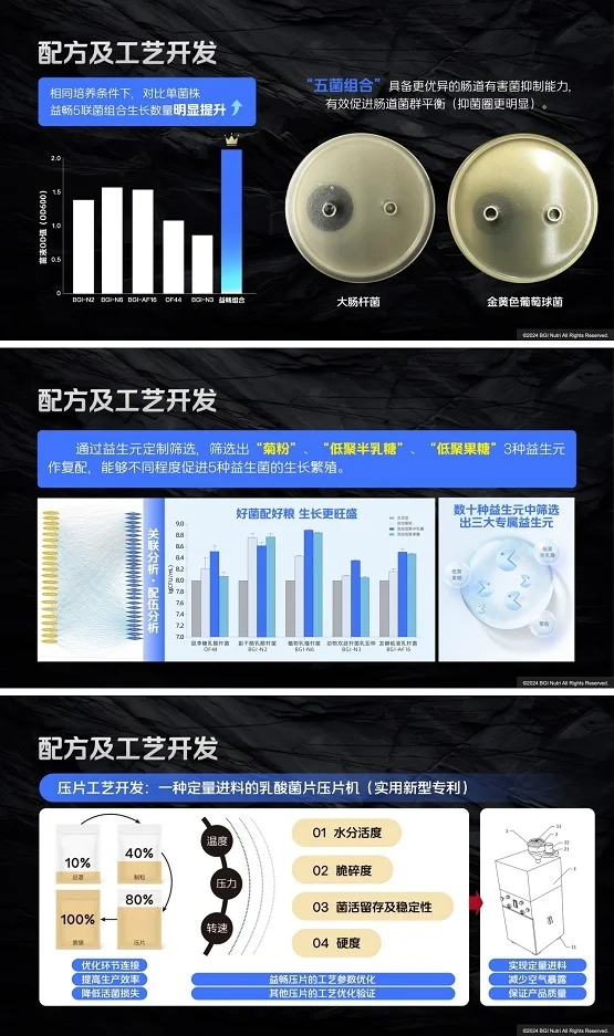 不仅如此,研发团队还发现精选的五株菌种在配合中展现出“兄弟齐心”的协同效应。它们不仅共同培养时生物量显著提升,还对常见肠道有害菌形成更强抑制。团队更依托菌株与益生元协同数据,为这个“黄金组合”精准匹配益生元,最大化激发菌群活性。