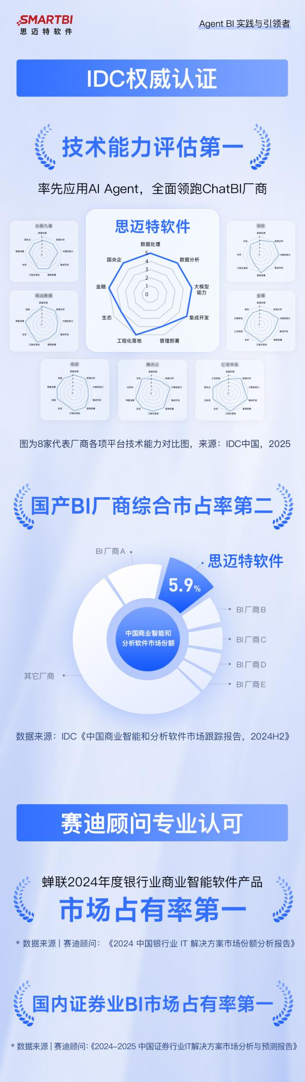 行业权威机构的评估进一步夯实其地位:2025年IDC中国报告显示,思迈特软件在 7 项平台技术能力维度排名第一,金融与央国企行业能力维度斩获满分,国产BI厂商综合市占率稳居第二,金融BI市场排名第一;赛迪顾问报告则证实,其连续多年蝉联银行业BI软件市场占有率榜首,同时领跑证券业BI市场。