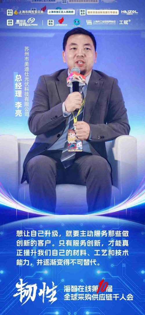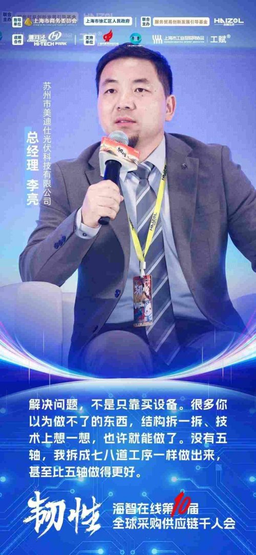 苏州市美迪仕光伏科技有限公司总经理李亮分享了创业初期,他在缺乏五轴设备的情况下,通过七八道工序拆分啃下高难度零件,从而成功绑定头部扫地机器人企业的经历。他指出,决定工厂能否进入新行业的,从来不是设备,而是工艺创新、问题理解与持续迭代能力。从材料、耐磨性到快充技术等方面,他始终沿着客户创新的方向同步升级能力,从普通供应商成长为深度参与产品迭代的战略伙伴。