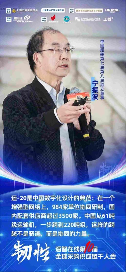 中国船舶第七届、第八届独立董事宁振波作主题演讲。他以自己五十年飞机总体设计经验为线索,从亚当·斯密《国富论》里的“分工+交易”谈起,回顾了现代工业体系的演进:从农业社会的小农自给,到工业社会依靠分工形成庞大供应链;从东风二汽“什么都要自己造”的初级工业阶段,到波音通过“造买政策”实现全球协同,再以运-20研制为例,展示了中国在数字化、协同制造和复杂供应链组织上的系统性突破。