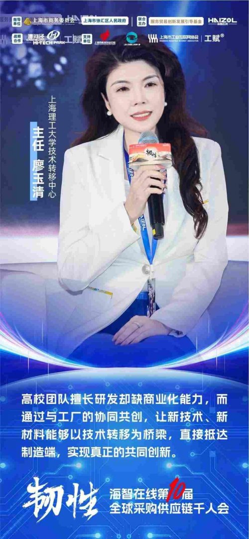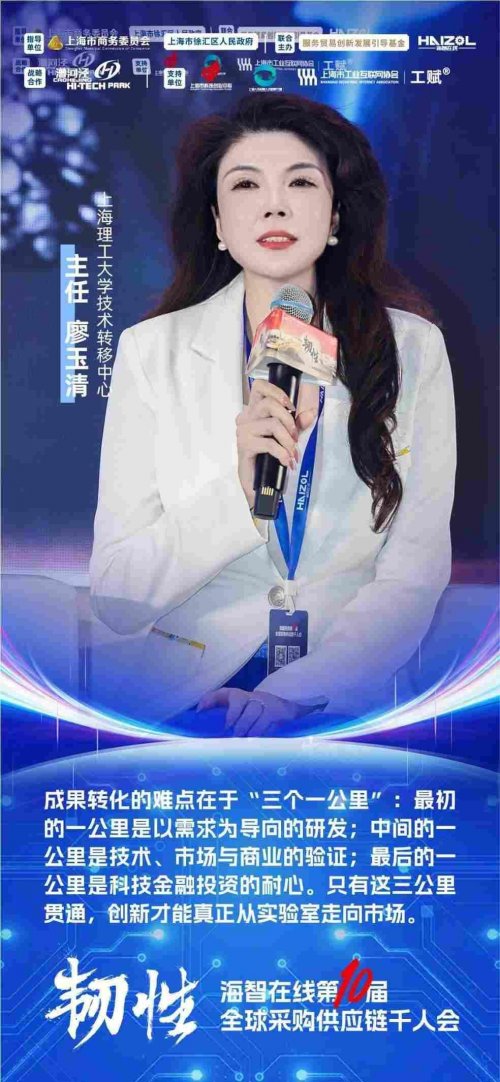 上海理工大学技术转移中心主任廖玉清从“三个一公里”的视角分享高校成果转化的难点。她表示,高校老师最擅长的是技术创新,但在产品设计和市场开拓方面往往存在短板,与工厂的协同是成果转化中的关键环节。她介绍了部分新材料和传感器项目在海智在线平台上对接工厂、完成应用定位的案例,认为如果高校、平台与工厂能在“研发—验证—应用”全链条形成稳定合作,将有助于让更多实验室成果真正落到产业一线。