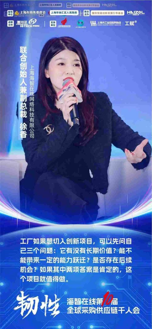 海智在线联合创始人兼副总裁徐香表示,作为平台,一方面要把优质创新项目“请进来”,围绕前沿赛道梳理供应链痛点,搭建更贴近真实场景的对接机会;另一方面要帮工厂“看得见、接得住”,在项目初期就通过创新研究院和工程技术团队,把需求、质量标准和交付要求讲清楚。她提出创新项目的L1/L2/L3分级模型,并给出“判断创新项目是否值得做”的三条准则:是否有长期价值、是否能带来能力跃迁、是否具备后续机会。