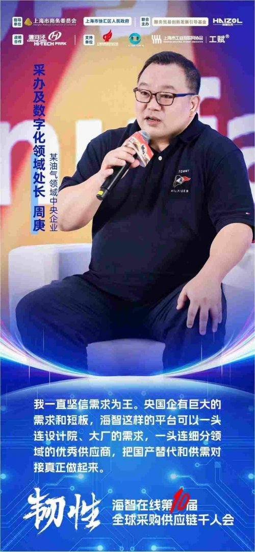 某油气领域中央企业采办及数字化领域处长周庚分享了央企在国产替代实践中的思路。过去,企业在海上装备领域高度依赖进口,如今系统梳理“卡脖子”环节,为国产替代开设通道,让更多国内制造企业进入核心供应链。他认为,央国企既是国家战略的承载者,也是中小工厂突破高端领域的重要“鱼塘”,而像海智这样的平台,可以成为央企需求与中小工厂能力之间的桥梁。