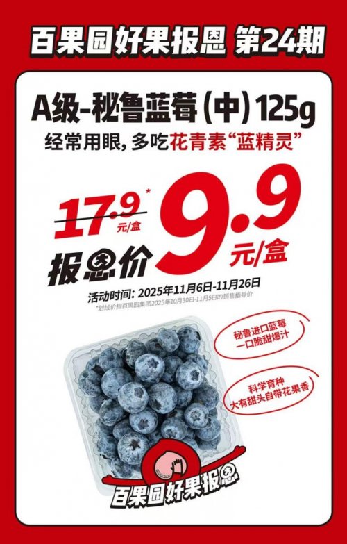 “好果报恩”活动推出以来,百果园始终以高品质高性价比为核心理念,致力于将全球优质水果带给更多消费者。此次第24期A级秘鲁蓝莓的推出,不仅延续了活动的初心宗旨,更直观展现了品牌在供应链把控与品质管理上的硬实力,让更多消费者可以品尝导精选时令的优质果品,轻松享受高品质水果生活。