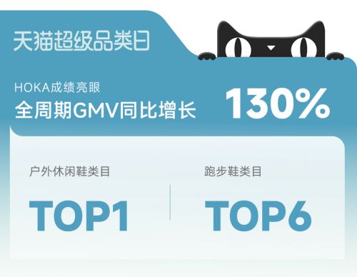 精准的货品策略与高效的运营执行,推动HOKA在本次天猫超级品牌日交出亮眼成绩单:活动全周期GMV同比增长130%。活动期间,HOKA位列天猫户外休闲鞋类目TOP 1,跑步鞋类目TOP 6,实现类目排名跃升。此外,通过线上线下的联动,HOKA的品牌形象更加深入人心,不仅实现了短期销量突破,更为长期品牌建设奠定了坚实基础。