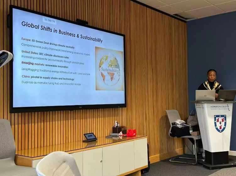 当日课程聚焦“全球化合规”与“可持续发展”两大核心议题。上午,剑桥大学法学院Ashlee Stetser副教授以《International Law and Diplomacy(国际法与外交)》为题,结合其参与欧盟跨境贸易谈判的实务经验,解析全球化背景下企业面临的法律风险与合规要点。其以“东南亚跨境投资税务争议”“欧盟进出口贸易合规稽查”等真实案例为依托,将抽象的国际法原则转化为企业可落地的操作指引,有效降低法律知识的理解门槛。针对学员普遍关注的“跨国财会业务中的税务合规边界”问题,Stetser副教授逐一拆解并提供定制化合规建议。
