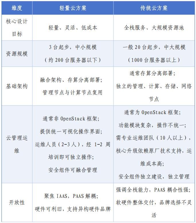 《报告》指出,轻量云作为私有云的一种部署形态,通过将计算、存储、网络等各类基础云服务能力高度封装集成,对平台架构、功能模块和管理运维流程进行优化,实现了“架构轻量化、管理轻量化、平台开放解耦”。