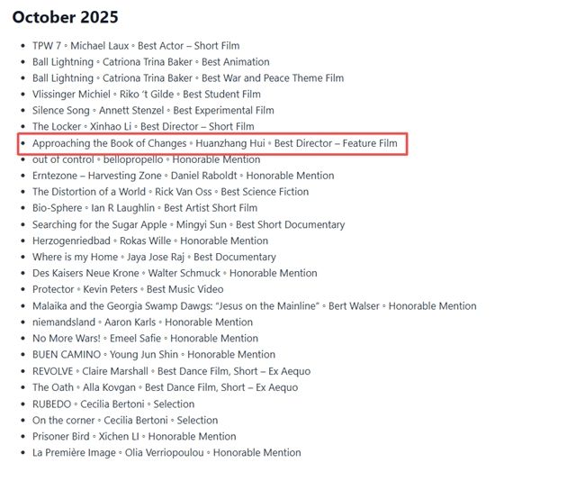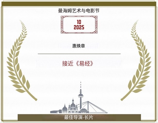 纪录片《走近易经》经过激烈角逐,获得曼海姆艺与术电影节(Mannheim Arts & Film Festival)2025年10月最佳导演奖。此次获奖使得惠焕章编剧导演的影视作品在国内外获得的奖项总数达到60多个,是国内近年来获奖最多的编剧导演之一。