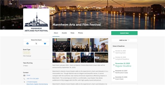 曼海姆艺与术电影节(Mannheim Arts & Film Festival)是在德国曼海姆市举办的影片展映及竞赛活动,展示各种类型的电影,包括剧情片、纪录片、短片等。除了常规的放映活动,还会不定期举办一些见面会等活动,为电影人及爱好者提供交流的平台。