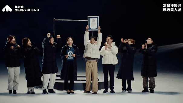 此次斩获吉尼斯世界纪录挑战的根基,正是美力城 在“六维标准”极致标准下诞生的产品。该产品不仅借鉴北极熊毛囊中空锁温结构,采用西伯利亚极寒地带的珍稀白鹅绒,经 AI 智能筛选与六道净化工艺处理,最终实现整衣的超轻重量与零下极寒环境保暖的完美平衡,最终美力城联手世界记录保持者李泽川通过了吉尼斯世界记录的认证。这一突破既印证了仿生科技的应用价值,更彰显中国品牌在高端服饰领域的技术实力。