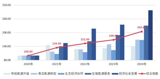 核心结果显示,2024年指数综合得分为204.86点,同比增长21.65%,五年累计增长104.86%,年均复合增长率达19.64%,呈现“稳步攀升、结构优化、质效双升”的总体特征,“十四五”以来能源高质量发展目标任务超额完成、转型成效远超预期。内蒙古能源经济逐步实现从规模扩张为主转向质量效益优先、从单一能源生产转向多维度协同发展、从传统能源依赖转向绿色转型引领的三大关键转变。