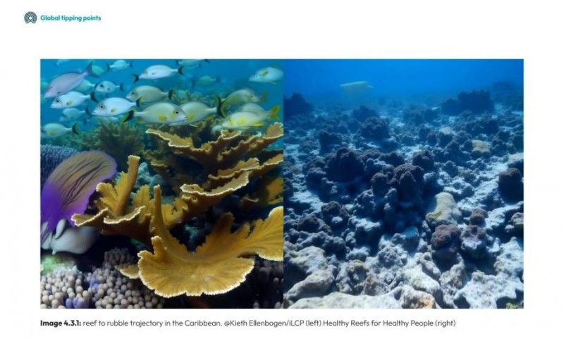 健康珊瑚礁与白化珊瑚礁对比 图源:《Global Tipping Points Report 2025》