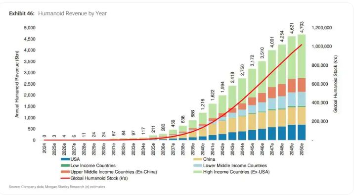 摩根士丹利认为,随着技术成熟和成本下降,人形机器人将首先在商业领域普及,随后进入家庭。报告预测,到2050年,商业应用将占总量的绝大部分,约9.35亿台,而家庭应用约为8400万台。这一宏大愿景正是吸引众多科技巨头和初创公司投身其中的根本原因。