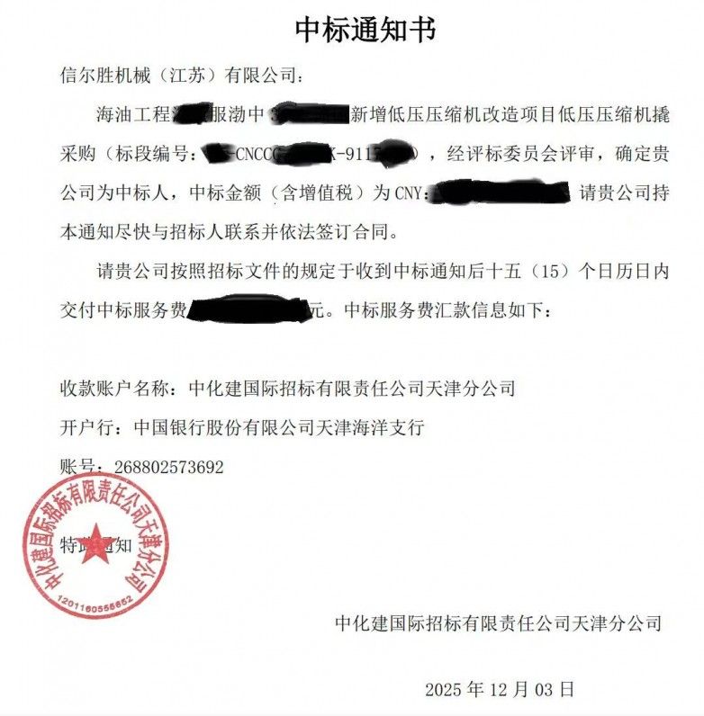 日前,信然集团旗下信尔胜机械(江苏)有限公司正式获授中国海洋石油集团有限公司低压压缩机改造项目中标通知书。这不仅是一次商业合作的成功落地,更是我国在关键能源装备领域实现自主可控、强化供应链韧性的一次重要突破,标志着国产高端压缩装备在国家战略性能源工程中的应用进入全面深化阶段。