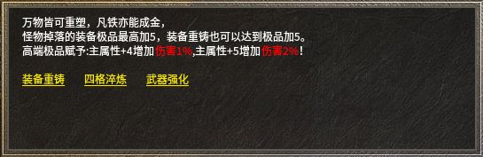 除了打怪刷宝外,玩家还可通过庄园铸炼师用三件相同装备重铸小极品(仅限战神、法神、天尊系列及记忆、灯笼、白色虎齿项链)。