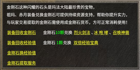 在“不卷氪金”的《枫心传奇》里,金刚石是最核心的硬通货,用于兑换技能书、双倍经验宝典或直接兑换经验,通过回收祖玛、赤月等高级装备即可获得。技能书如烈火剑法、冰咆哮等均可以十颗金刚石兑换,显著提升战斗能力——毕竟在复古设定中,等级提升至关重要,金刚石的合理使用最能帮助玩家领先一步。