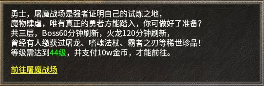另外,游戏还提供了一些特色玩法,比如怪物强度很高的屠魔战场可获取屠龙系列装备;PVE玩累了又不想真刀真枪PVP的话,可以去武林大会点到为止地大战一番;还有参与行会争霸去争夺屠龙级武器的奖励,重现团队荣耀与归属感,等等。