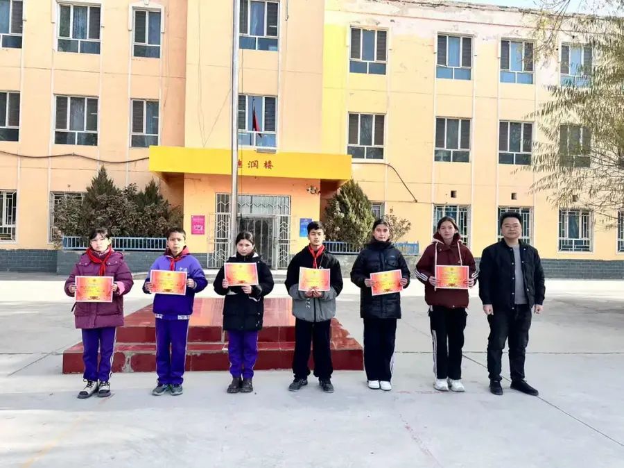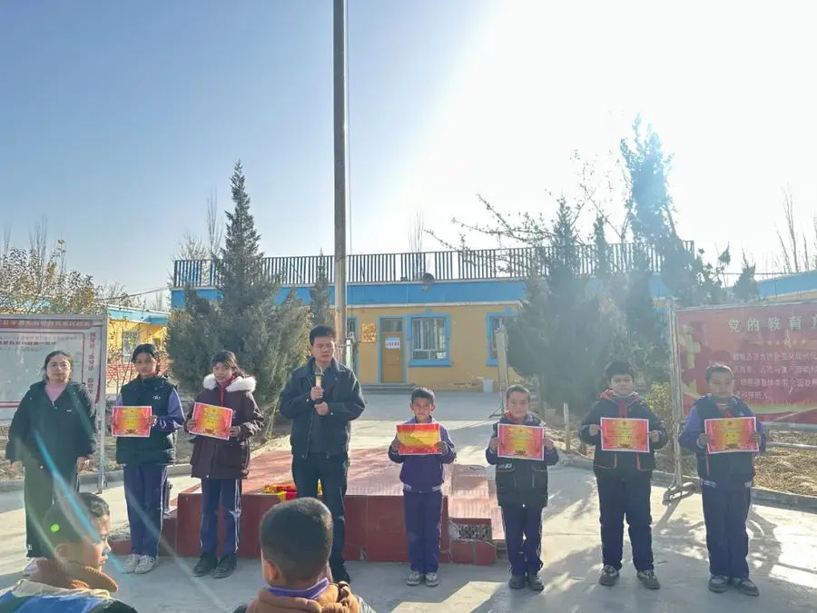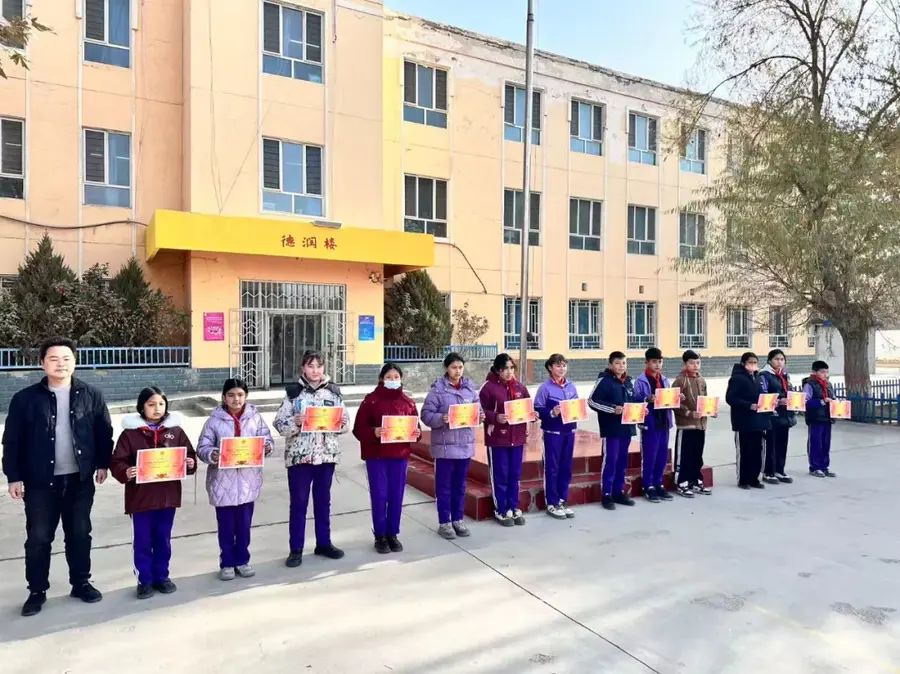 颁奖环节结束后,全体获奖学生与校领导在教学楼前合影留念,记录下这一光荣而难忘的时刻。阳光洒在孩子们灿烂的笑脸上,也照亮了他们未来的求学之路。此次“育杰奖学金”发放仪式的圆满举行,不仅是对优秀学生的肯定与鼓励,更是对全校学生的激励与鞭策,为萨依巴格乡小学良好学风的建设注入了新的动力。