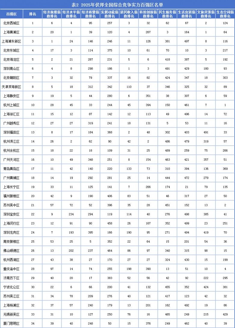 从具体城区来看,百强区也存在着头部效应。北京市西城区位居综合排名榜首,上海市黄浦区、浦东新区分列第二、三位,其中浦东新区GDP突破1.7万亿元,是我国首个GDP超万亿的城区,彰显出超大城区的经济能级。