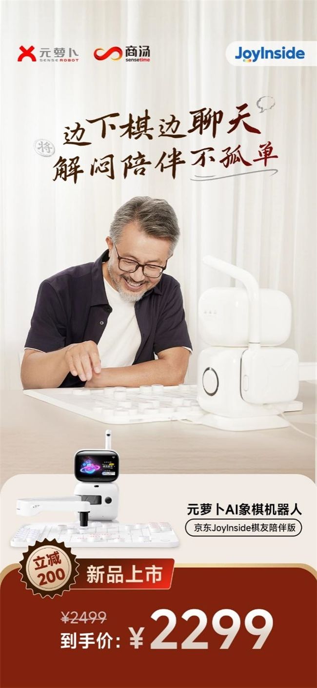 近日,商汤科技旗下家用机器人品牌“元萝卜SenseRobot”发布与京东联合定制的新一代AI象棋机器人产品:元萝卜AI象棋机器人——京东JoyInside棋友陪伴版。此次新品专为老年群体深度定制,在延续“护眼、益智、陪伴”核心设计理念的基础上,创新融合京东JoyInside大模型对话能力,实现“不仅能下棋、会讲棋,更能陪聊谈心”的全场景陪伴体验,重新定义老年人休闲娱乐与情感陪伴的生活方式。