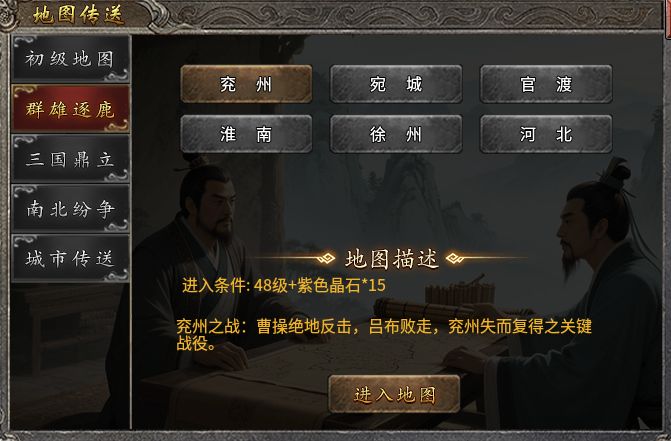 地图探索遵循着精妙的递进设计:图一只有紫名精英怪,图二就会出现橙名BOSS,只有击败图二的BOSS,才能开启图三的传送点,见到最终的红色BOSS。例如在兖州地图,你必须先击败夏侯惇,才能进入图三挑战最终BOSS陈宫。这种层层递进的探索感,让每一次地图攻略都像是一场精心策划的军事行动。