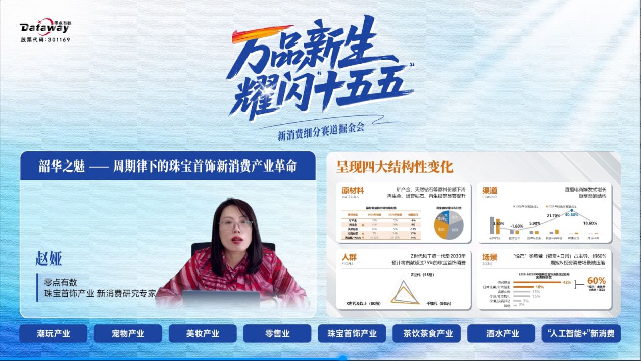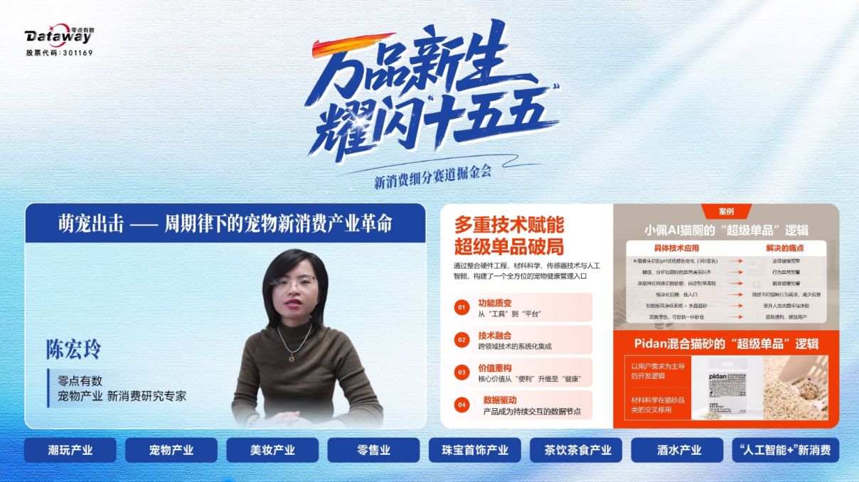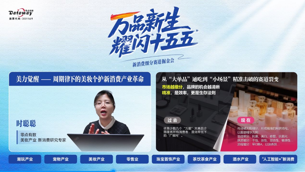 2025年12月17日,由零点有数主办的“万品新生,耀闪‘十五五’——新消费细分赛道掘金会”在线成功举办。活动通过多平台同步直播,吸引了来自消费产业、投资机构、研究学者及媒体代表的广泛关注。本次活动紧扣“十五五”规划中对高质量消费品供给的要求,探讨新消费产业革命趋势与机遇。零点有数新消费研究专家团首次公开亮相,深入解读潮玩、宠物、美妆、零售、珠宝、茶饮、酒水等细分赛道发展动态,并探讨人工智能等技术对消费场景的赋能路径,旨在洞察趋势、凝聚共识、赋能产业,共同探寻细分赛道中的增长机遇。
