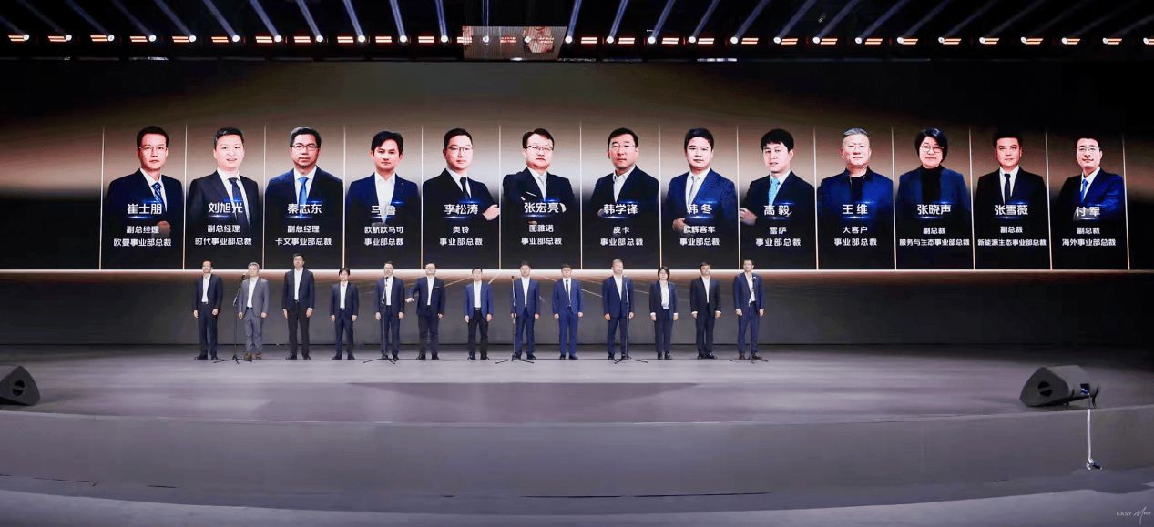 2026年目标的达成,离不开业务端与区域端的协同攻坚。大会伊始,13位事业部总裁与13位区域营销中心负责人(含12位中心总经理及分管领导)集体亮相,展现了福田“主力作战部队+战区支援中心”的矩阵式作战体系。作为福田与合作伙伴结成的“发展与利益共同体”,这支核心团队既是战略落地的关键抓手,也是赋能渠道、联接伙伴的坚实桥梁,他们将带领团队践行 “敢于竞争、敢于胜利” 的宣言,推动营销变革、渠道优化、政策落地等举措直达终端,为全年销量增长与高质量发展提供坚实保障。