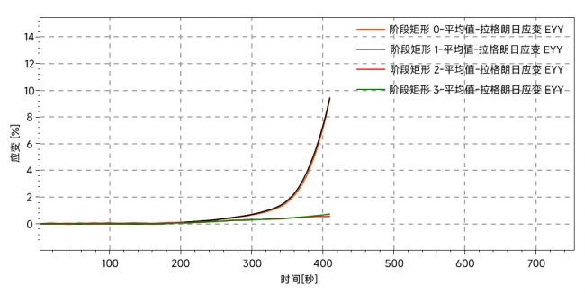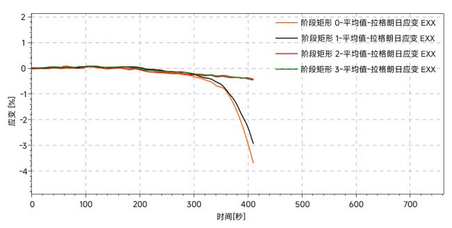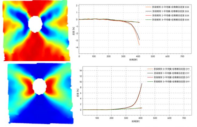 在0~300 s加载期,阶段矩形0~3的X方向拉格朗日应变Exx均表现为缓慢线性增长的负应变,表明试件处于弹性-塑性变形阶段,负应变主要体现泊松效应,即垂直于拉伸方向的收缩。当加载试件超过300 s后,Exx的演化出现明显分区特征:左右阶段矩形0、矩形1负应变呈现明显的抛物线式向下加速增长趋势,表明材料在孔洞两侧开始进入塑性流动阶段,出现颈缩现象,导致泊松收缩效应增强;上下阶段矩形2、矩形3负应变仍保持线性增长,表明孔洞上下区域远离应力集中区,塑性变形相对较缓。