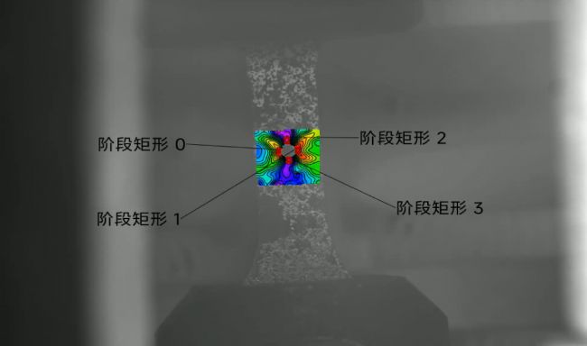 为精确捕获试件在中心孔洞区域的应变集中和分布情况,在孔洞周围对称选取4个阶段矩形区域,矩形0和矩形1分别选择在中心孔洞的左右两侧,这两个区域用于捕捉横向收缩与孔边应变集中;矩形2和矩形3分别选择中心孔洞的上下两侧,这两个区域反映了拉伸主载荷方向(Y方向)上的变形演化。