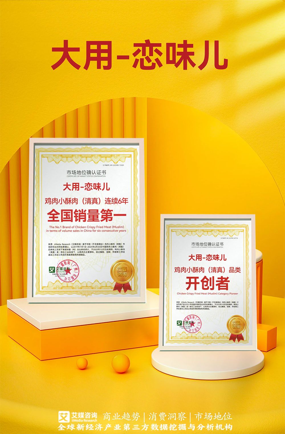 基于艾媒自主研发并获得省部级重大科技专项立项的CMDAS大数据系统监测及严格的调查,以及对中国(不含港澳台)鸡肉小酥肉(清真)市场研究比对的结果进行统计确认,恋味儿荣获全球领先的新经济产业第三方数据挖掘和分析机构iiMedia Research(艾媒咨询)授予的“鸡肉小酥肉(清真)连续6年全国销量第一”“鸡肉小酥肉(清真)开创者”双项市场地位确认。
