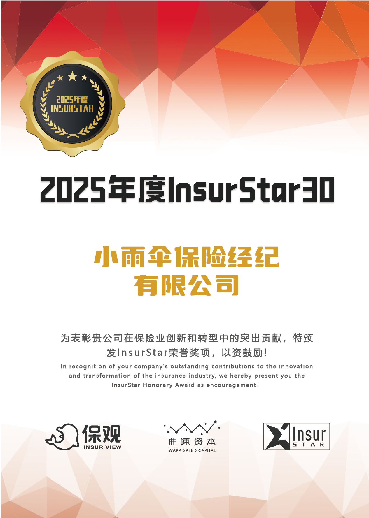 近日,备受行业瞩目的2025年度保观·InsurStar保险行业年度评选结果揭晓,手回集团旗下小雨伞保险经纪凭借在品牌影响力、产品创新、科技应用与服务质量等领域的卓越表现,成功入选“2025年度InsurStar30”榜单,与全行业优秀保险公司、保险科技公司等共同跻身年度标杆阵营,这一荣誉既是行业对其综合实力的权威认可,更是千万用户信赖的有力见证。