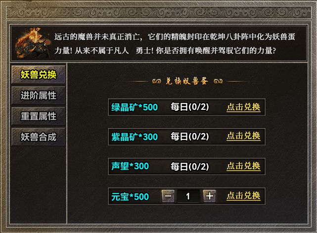 妖兽的成长路径极为亲民:每击杀一只怪物,不论普通小怪还是终极BOSS,均为妖兽提供1点经验。你也可以通过声望与元宝加速养成。获取方式更是多样——挑战对应BOSS直接掉落,或通过每日活动获取的“妖兽蛋”进行抽取。集齐5只相同妖兽,更能合成更高品阶,让成长每一步都充满策略与惊喜。