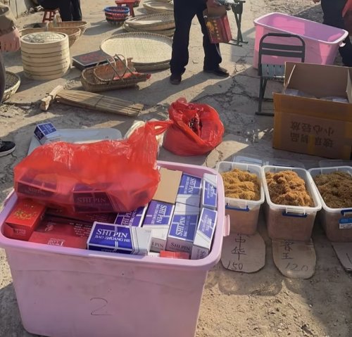 图为在集贸市场查获的烟丝、空烟管