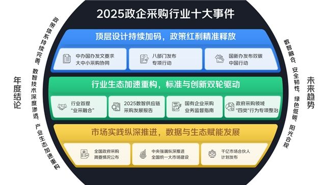 2025年,中国政企采购行业迈入数字化转型与高质量发展的关键攻坚期。政策体系持续完善、数智技术深度渗透、产业生态加速重构,成为本年度行业发展的核心特征。从顶层设计的密集出台到行业标准的迭代完善,从创新理念的落地实践到市场主体的协同发力,本文通过梳理2025年政企采购行业十大核心事件,全景呈现行业发展全貌。