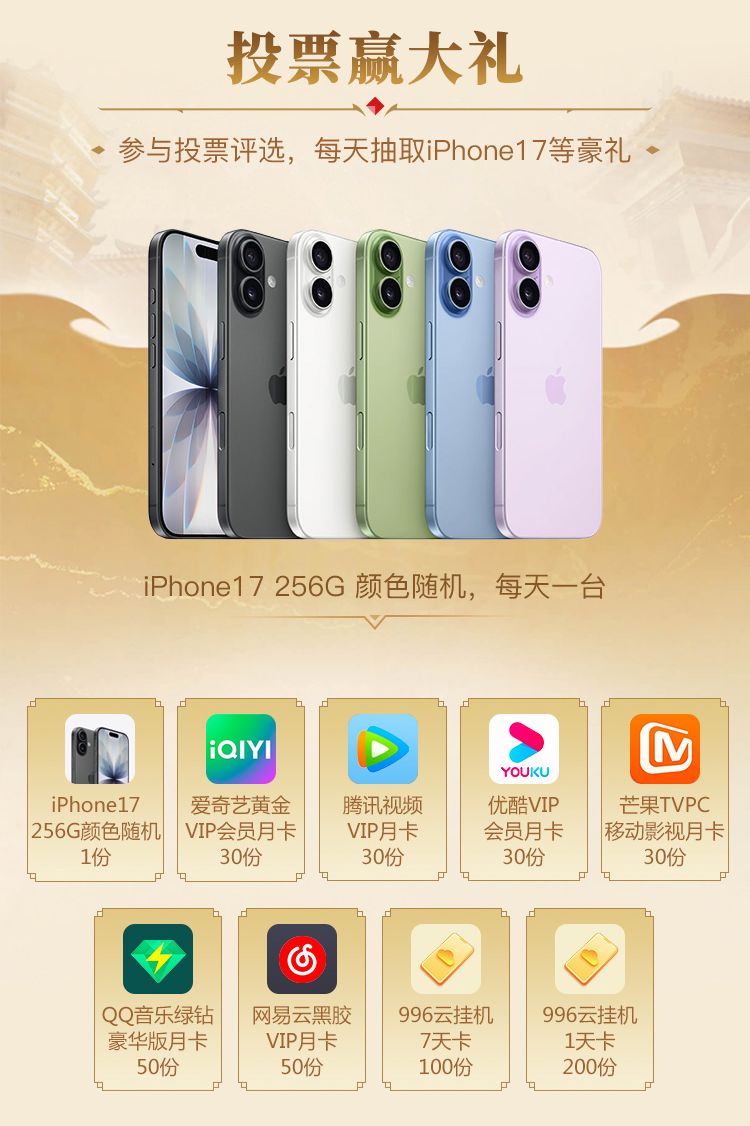 如果说为爱发电是情怀,那么“为爱发电还有巨奖抽”就是996传奇盒子实实在在的诚意!今年的投票抽奖奖励全面升级,每天都会抽出一台iPhone17作为终极豪礼,另外还有爱奇艺、腾讯视频、优酷、芒果TV月度VIP卡等海量娱乐会员福利,以及QQ音乐绿钻豪华版、网易云黑胶VIP月卡等音乐特权礼包,再加上996云挂机7天卡、1天卡等实用游戏福利,让玩家在助力心爱游戏的同时,也有机会为自己赢得一份惊喜。