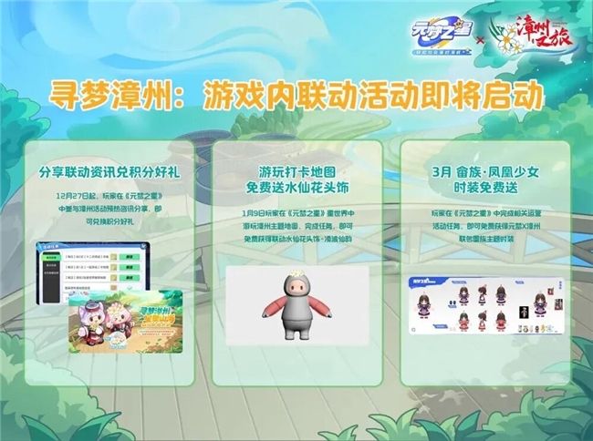12月27日,在《元梦之星》发布两周年之际,“寻梦漳州·星聚山海”元梦之星×漳州文旅联动发布仪式在漳州古城成功举办。本次联动推出四张充满漳州风情的主题地图,让漳州的地标建筑和非遗“跳”进游戏世界,玩家可以实现“坐在家里,玩转漳州”。