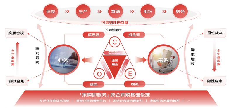 业采融合的核心,在于打破采购与业务之间传统的职能边界、打破采购体系的外部边界,推进政企采购信息流、商流、物流、资金流“四流合一”,实现采购与研发、生产、营销、组织、财务的“五大融合”,最终通过与采购部门的全面协同形成业采融合,加速破解政企采购“价格、质量、效率”不可能三角,全面向“成本、效率、体验”的黄金三角转型。