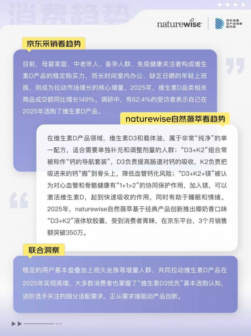 针对维生素D产品的科学复配消费诉求,naturewise自然薇萃表示,在维生素D产品领域,维生素D3和载体油,属于非常“纯净”的单一配方,适合需要单独补充和调整剂量的人群;“D3+K2”组合常被称作“钙的导航套装”,D3负责提高肠道对钙的吸收,K2负责把吸进来的钙“搬”到骨头上,降低血管钙化风险;“D3+K2+镁”被认为对心血管和骨骼健康有“1+1>2”的协同保护作用,加入镁,可以激活维生素D,起到快速吸收的作用,同时有助于睡眠和情绪。2025年,naturewise自然薇萃基于经典产品创新推出椰奶香口味“D3+K2”液体软胶囊,受到消费者青睐,在京东上线3个月销售额突破350万。