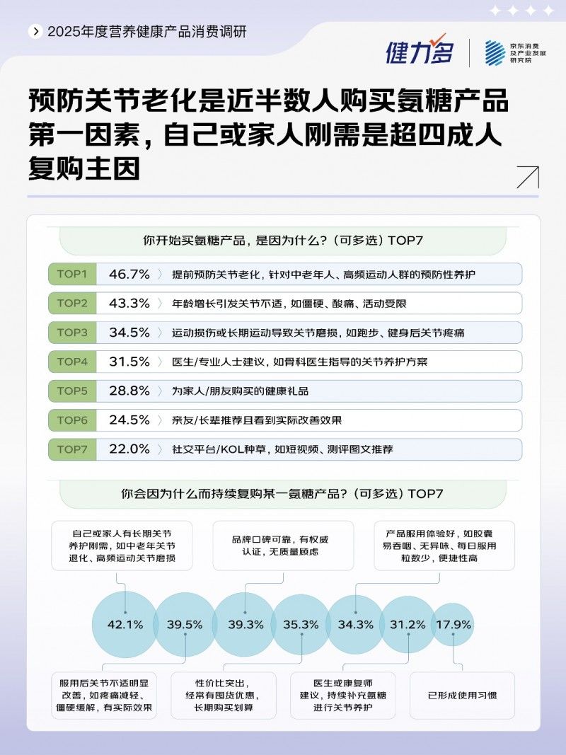 联合洞察显示,关节养护需求正从“中老年缓解”延伸至全年龄段“主动预防”,产品端也从“氨糖+软骨素”的广谱配方,转向了“人群细分+场景定制+成分复配”的精准化升级方向。