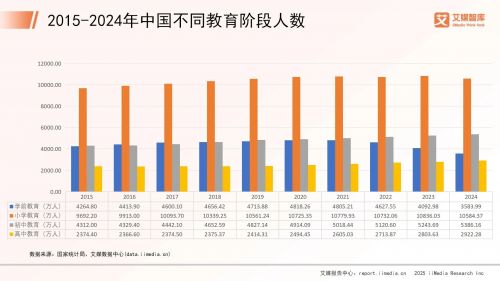 政策东风之下,海量教育需求亟待释放。iiMedia Research(艾媒咨询)发布的《2025年中国素质教育及其细分行业发展状况数据》显示,2024年中国从学前教育到高中教育阶段的学生总规模庞大,超2.24亿人,其中学前教育人数为3583.99万人,这构成了科技教育需求最广泛、最稳定的用户基本盘。