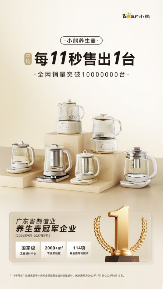 从小气泡养生壶解决传统沸煮的“暴脾气”、“大嗓门”,让养生更好融入办公场景,为用户带来可以轻音慢煮、文火柔炖的惬意养生体验;到全玻璃养生壶肩负起现代人的快节奏生活,以大功率满足高效养生需求......小熊电器养生壶创新的每一个出发点,都建立在用户不断进化的需求之上。也正因如此,其每款“好产品”也都赢得了来自市场销量和用户口碑的回馈。据统计,自2022年1月1日至2025年6月15日期间,小熊电器养生壶全网销量突破1000万台,相当于每11秒售出1台,连续7年稳居养生壶市场占有率第一。